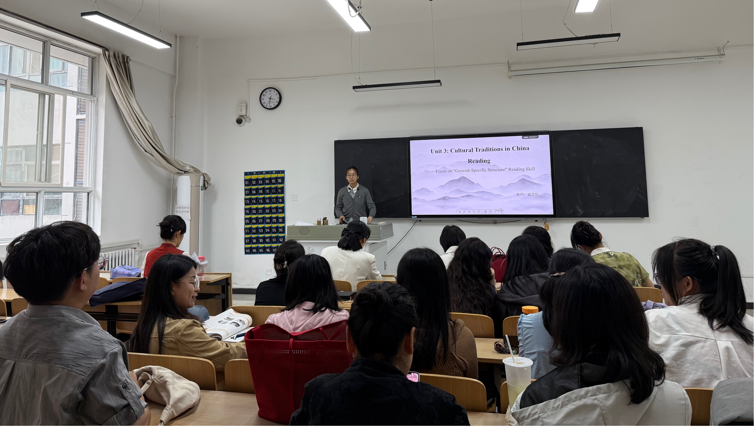 第一位进行磨课的是教师戴欣怡。她以《E英语》教材为基础,授课主题为“Cultural Traditions in China (Reading)”,重点训练学生把握“总—分”结构阅读技能。戴老师通过清晰的课堂结构、扎实的内容讲解,展现了其对阅读教学的深入理解。