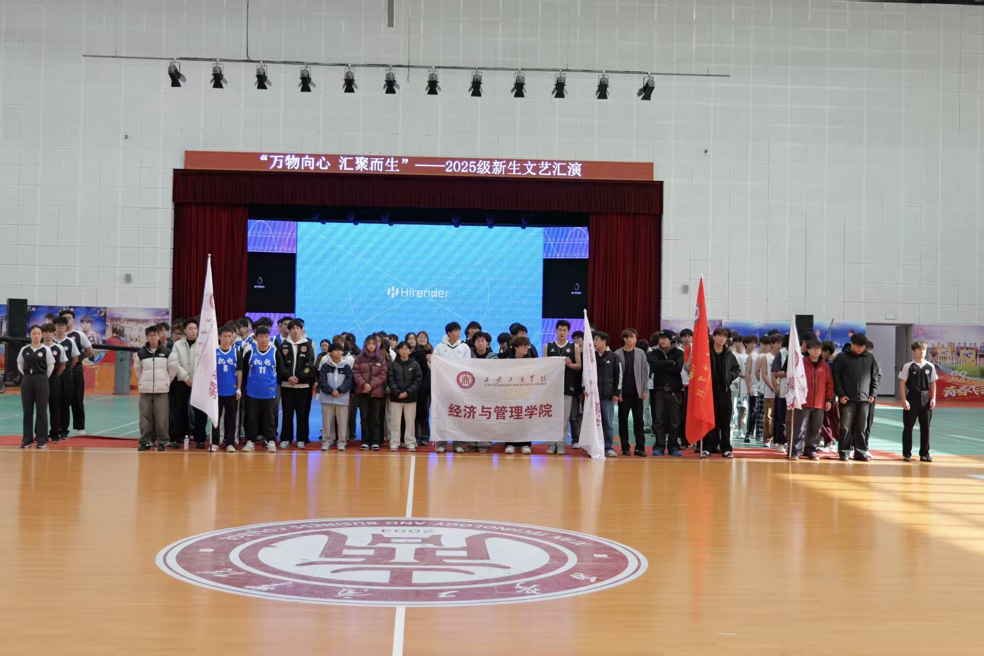 【各学院参赛队伍在开幕式现场列队,经济与管理学院代表队手持院旗合影】
