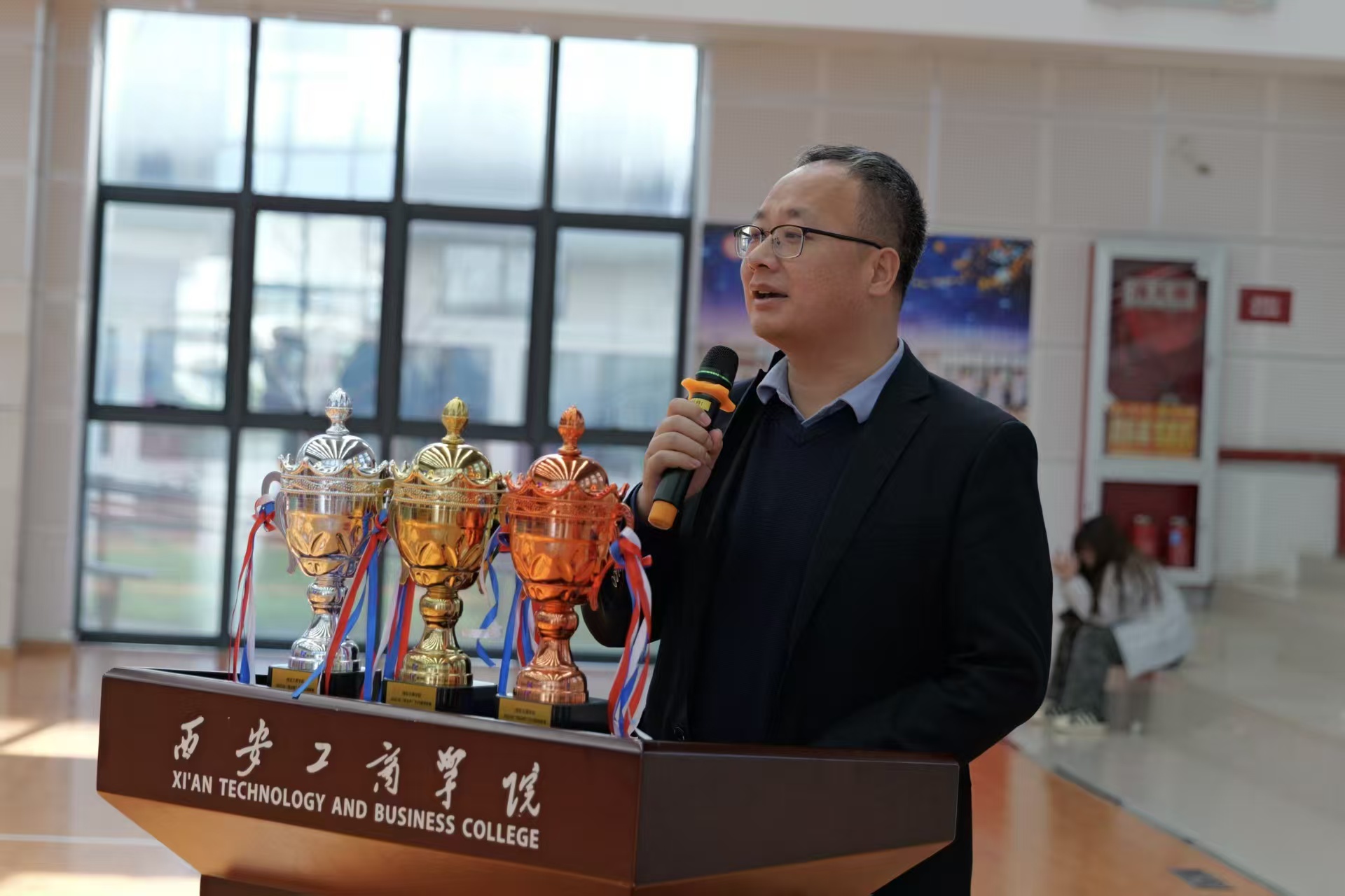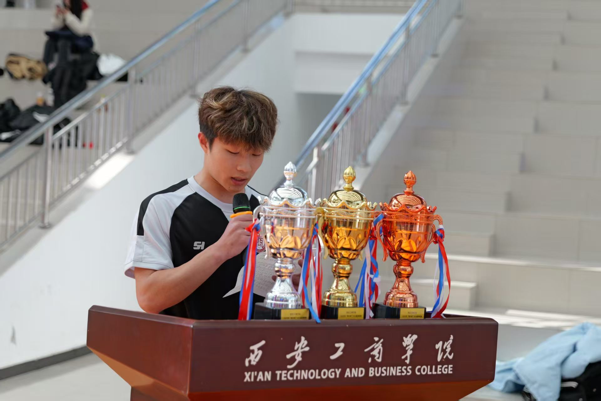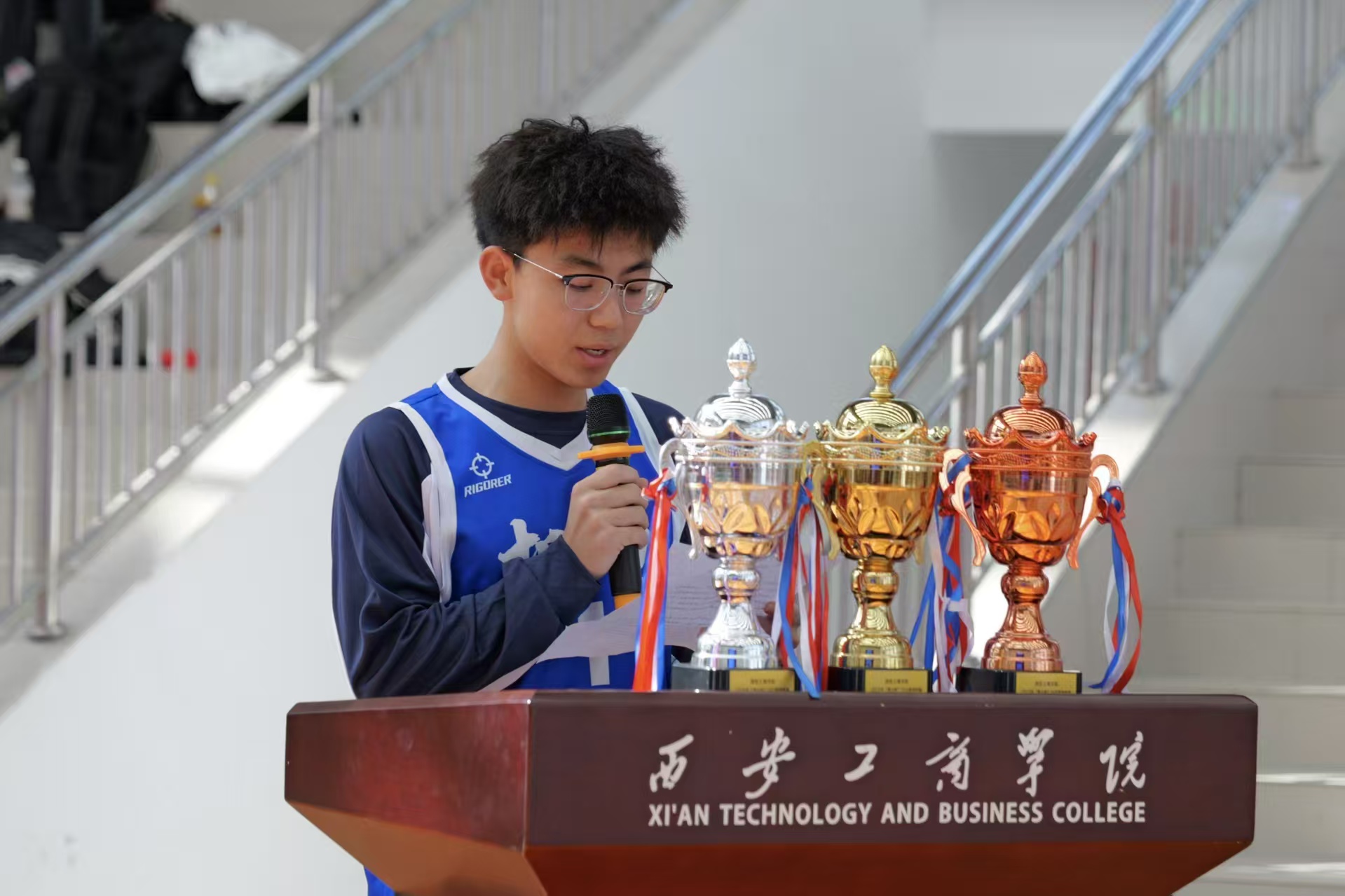通识教育学院教学副院长张彬鹏应邀出席开幕式,与运动员代表白驭华、裁判代表唐大江及全体参赛队员共同见证这场青春赛事的开启。开幕式现场的讲台上,金、银、铜三座奖杯静静陈列,在灯光下熠熠生辉,提前点燃了大家对赛事荣誉的期盼。